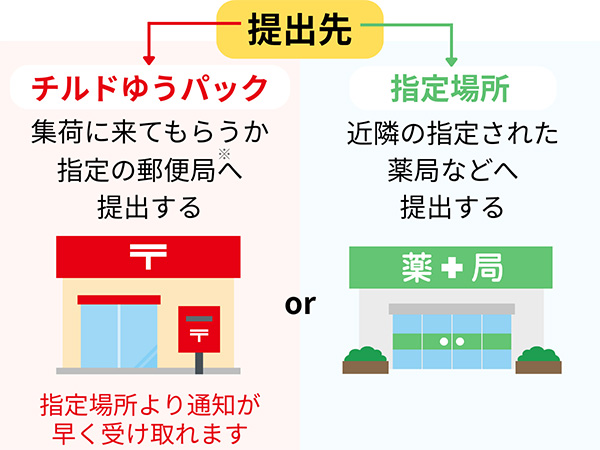 提出容器を検体提出袋に入れ、8時間以内にチルドゆうパック(配送料有料)、もしくは近隣の薬局などの指定場所(配送料無料)へ提出します。