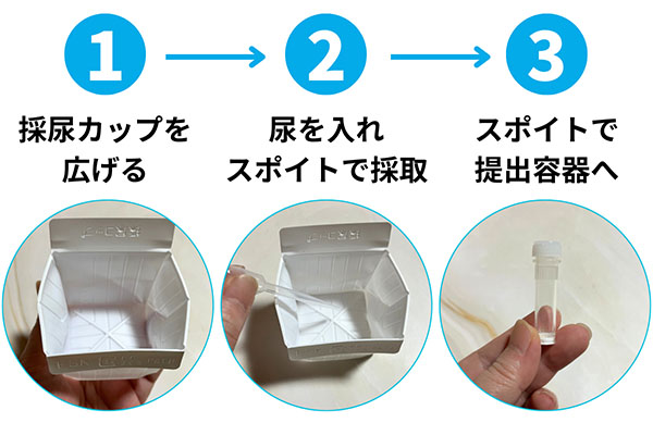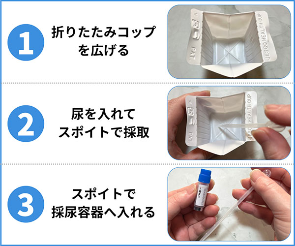手順はカンタン!採尿カップを広げて容器を作り、スポイトで尿を採取して提出容器に入れるだけ。