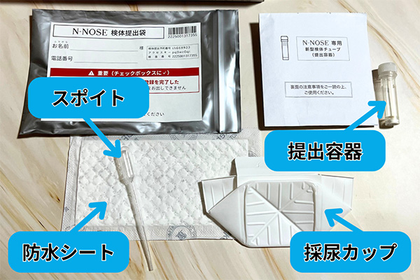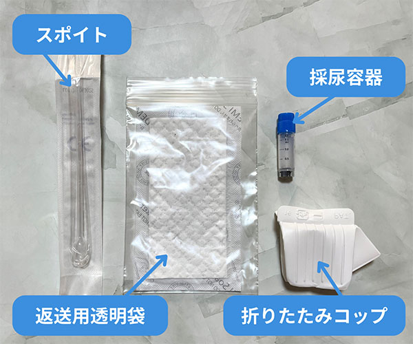 返送用箱の中には、スポイト・返送用透明袋・採尿容器・折りたたみコップが入っています。
