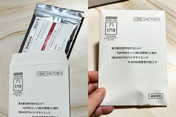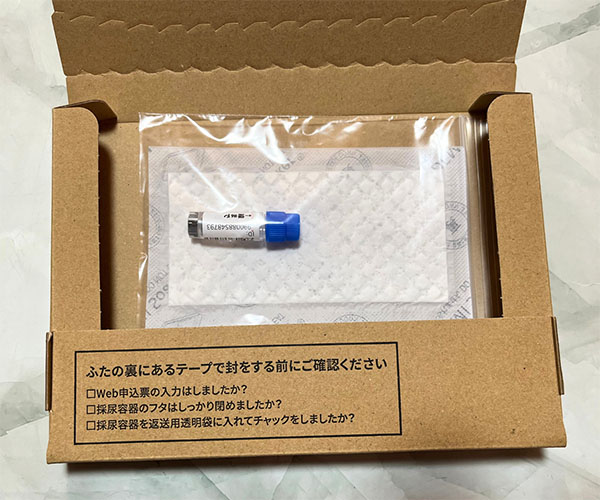 終わったら検体提出袋に必要事項を記入して採尿した提出容器を入れます。その後、同封されているポスト投函用封筒に入れ封をしてください。