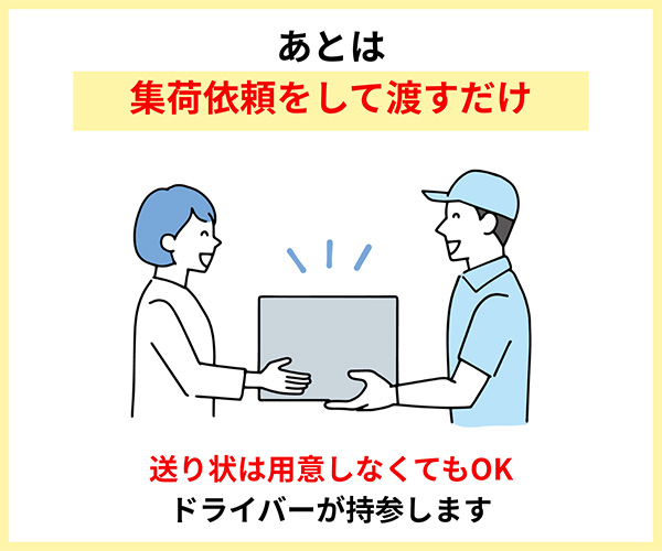 発送方法は集荷になります。取りに来てもらえるので自分で出しに行く手間がかかりません