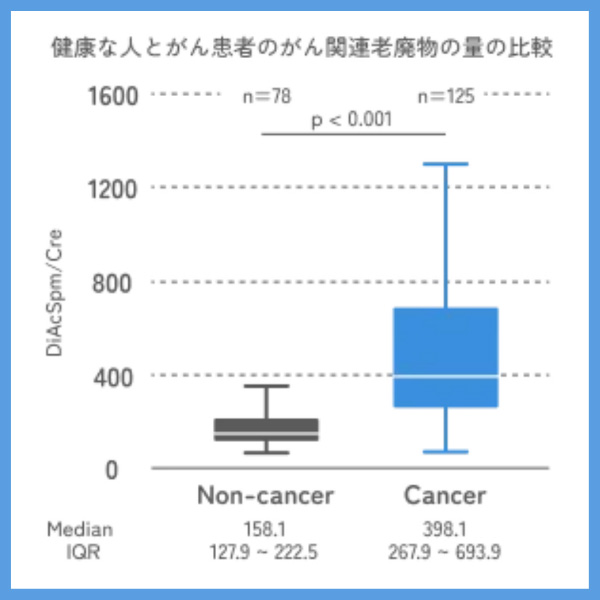 代謝物とはがんになると増える老廃物「ジアセチルスペルミン(DiAcSpm)」を指し、この量を測定することでリスクが高いかどうかを調べることができる仕組みです。